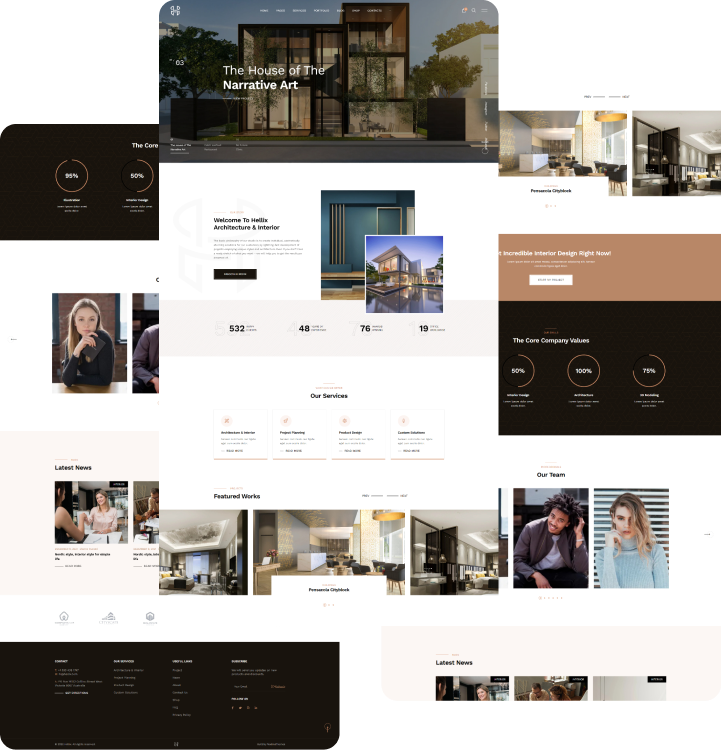 Mẫu website kiến trúc được thiết kế theo phong cách hiện đại, tinh tế, sử dụng tông màu trung tính và bố cục tối giản nhằm tôn lên vẻ sang trọng, chuyên nghiệp. Giao diện phù hợp cho các công ty kiến trúc, nội thất, xây dựng muốn giới thiệu dự án, dịch vụ và khẳng định phong cách thiết kế đặc trưng của mình.