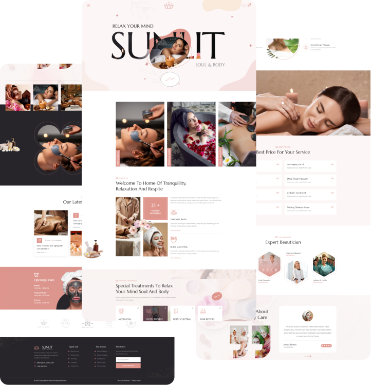 Mẫu website Spa được thiết kế tinh tế, sang trọng và chuẩn thẩm mỹ, phù hợp cho spa, thẩm mỹ viện, trung tâm chăm sóc sắc đẹp, massage trị liệu hoặc doanh nghiệp trong lĩnh vực làm đẹp – chăm sóc sức khỏe. Giao diện hiện đại, sử dụng gam màu nhẹ nhàng, hình ảnh chất lượng cao và bố cục hài hòa, mang đến cảm giác thư giãn và chuyên nghiệp ngay từ cái nhìn đầu tiên.